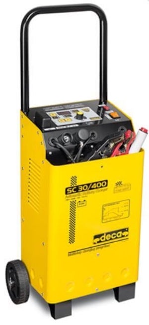 Tuotemerkki ja malli: Deca SC 30 / 400 Tuotetyyppi: Akkuvaraaja / apukäynnistin Liitäntäjännite: 230 V Liitäntäteho: 0,7 kW (lataus) / 7,8 kW (apukäynnistys) Akun jännite: 12 V / 24 V Keskimääräinen latausvirta: 20 A Suurin latausvirta: 30 A Käynnistysapu kuormittamattona: 400 A Käynnistysapu kuormitettuna (1 V): 230 A Suositus akkukapasiteetille: 5–400 Ah Akkutyypit: 12/24 V lyijyakut sekä AGM, GEL, Ca/Ca Mitat: 390 x 280 x 903 mm Paino: 20,6 kg